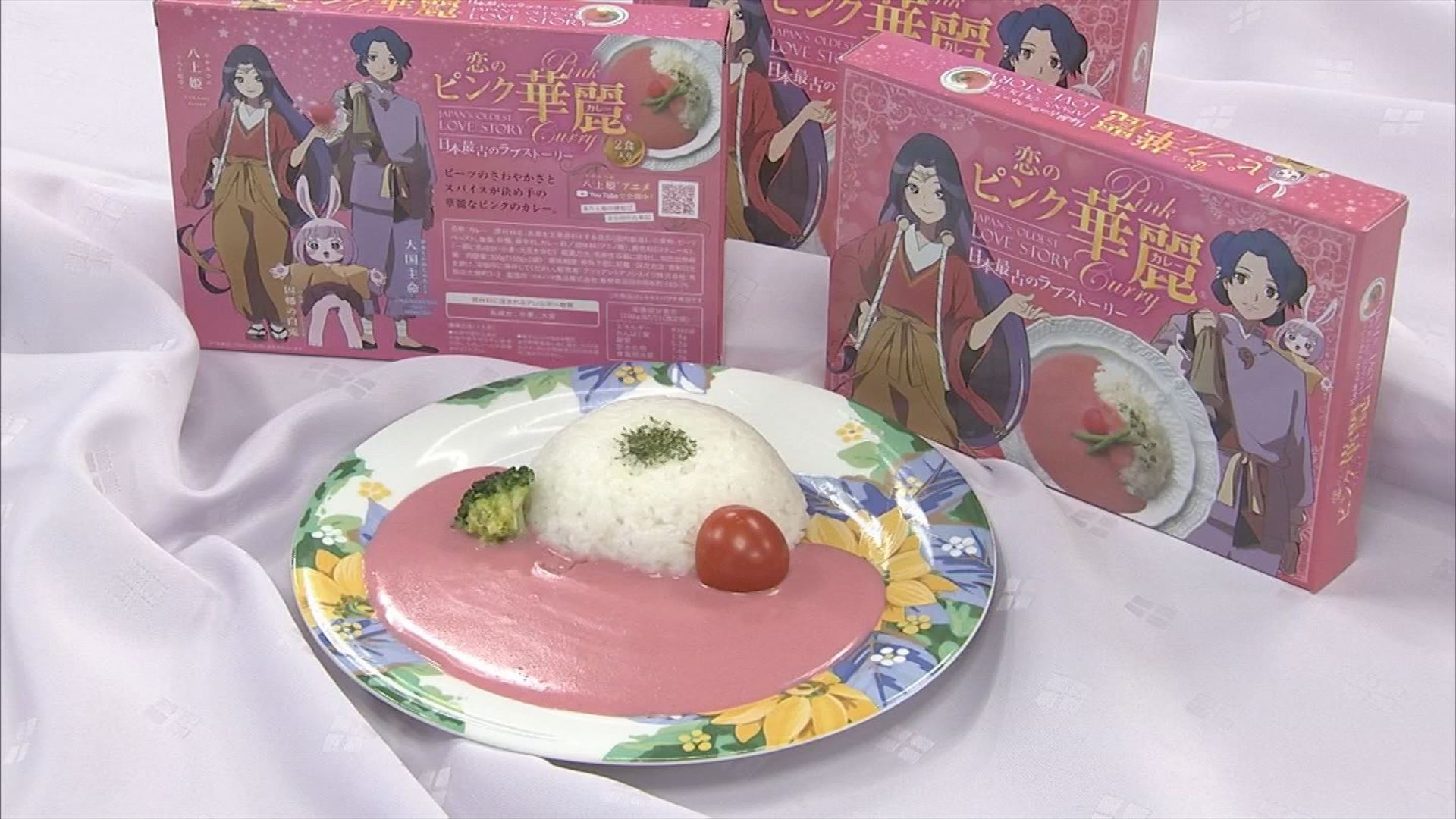野菜のビーツを元に、鮮やかなピンクに仕上げたカレー。鳥取生まれの話題の商品も、このアニメとコラボし、パッケージにあしらいました。