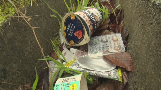 「こちらの公園はすべり台やトイレが設置してあり、比較的広い公園ですが、園内見渡してみると、お菓子の空き箱、ジュースの缶が落ちています。さらに側溝ご覧ください。大量の空き箱ジュースの缶が散乱しています。」