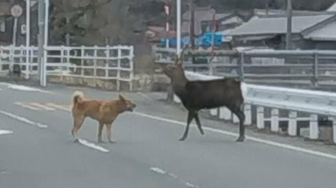 ツイッターに投稿された1枚の写真は1日、鳥取県智頭町で撮影されました。イヌと野生シカとのストリートファイト。その時一体、何が起きていたのでしょうか。