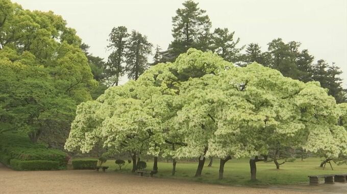 「松江城のナンジャモンジャはまさに見ごろを迎えていますが、今日は寒いです。歩く人もジャケットを羽織るなどして観光を楽しんでいます」