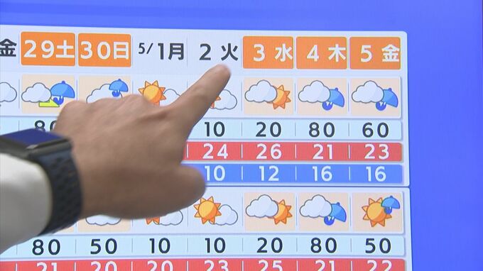 「29日、30日の土日は残念ながら雨。しかも結構しっかり降りそうで、屋外のレジャーは雨対策が必要となりそうです。5月は晴れスタートの一方、ゴールデンウィーク後半の後半戦は再びぐずつく見込みです」