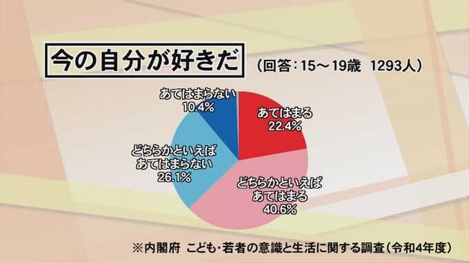 内閣府が行った意識調査の結果では、「いまの自分が好きか」という質問では、15~19歳の63%が「あてはまる」「どちらかといえばあてはまる」と回答している一方、「自分らしさを強調するより、他人と同じことをしていると安心だ」という項目に関しては、58.8%が「あてはまる」「どちらかといえばあてはまる」と回答しました。