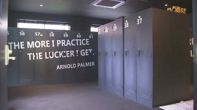 「こちら会員専用のロッカールームということなんですが、漆黒の重厚感あふれるロッカー、そして、こちらには大きな文字で、アーノルド・パーマーのメッセージが書かれています」