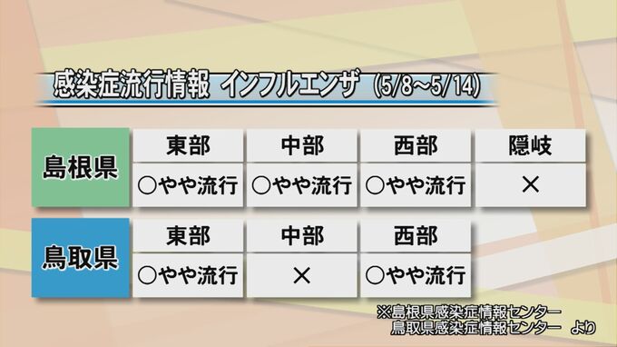 両県の感染症情報センターの感染症流行情報によると、島根県では東部・中部・西部でやや流行。鳥取県では東部と西部でやや流行しているということです。