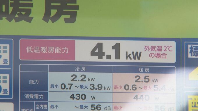 ポイントは「低温暖房能力」です。エアコンの心臓部に当たる熱交換器の力を表していて、大きい方がパワーに余裕があります。
