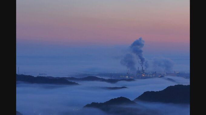 雲海からのぞく山々と、煙突からもくもくと煙を吐き出す工場の夜景。