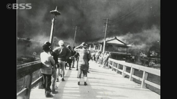 上空からの写真では、松江大橋北詰から東に焼け跡が広がっていて、今は埋められた漁師町川という水路でようやく火を押し留めたということです。