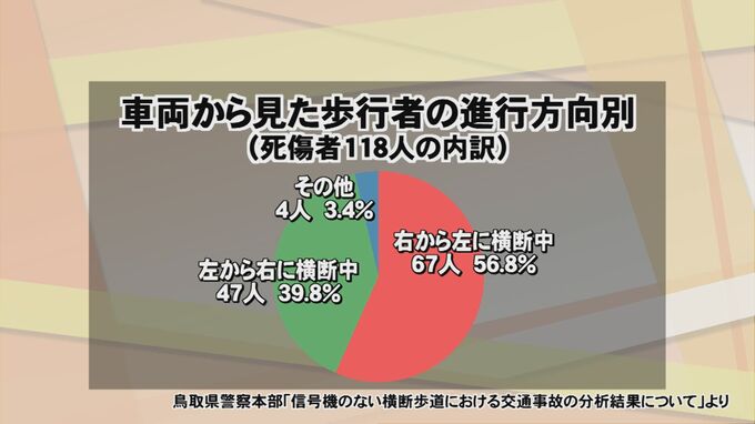 死傷者の数は118人にのぼりますが、このうち、車から見て「右から横断中」だった人が67人で、「左から横断中」の人の約1.4倍でした。