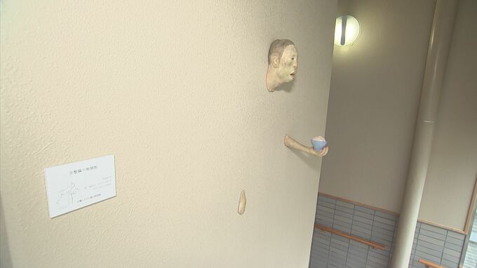 茶碗を持った男性が突撃しすぎて壁にめり込んでいます。