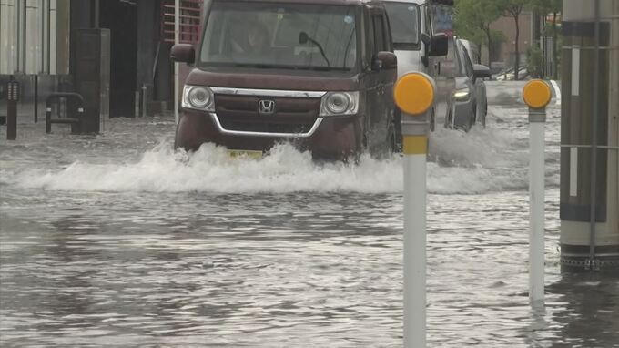 車が大きな水しぶきをあげるそばでは道路を管理する担当者の姿が。