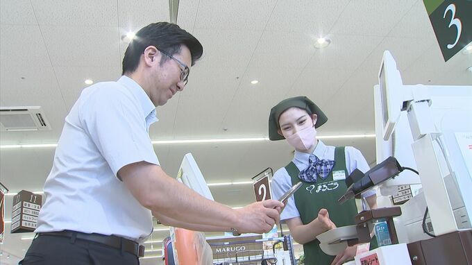 キャンペーン初日の1日、市内のスーパーで伊木市長が実際にJーCoin Payを利用して昼食を購入しました。