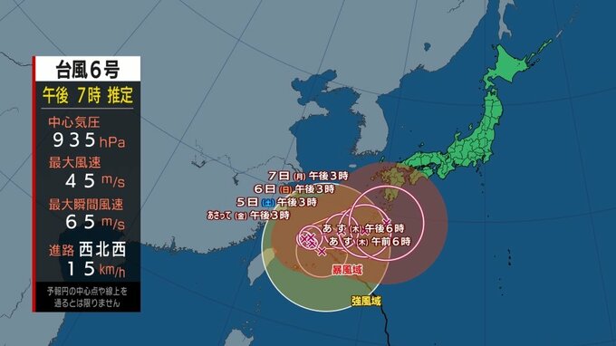 大型で非常に強い台風6号の中心の気圧は935ヘクトパスカル、中心付近の最大風速は45メートル、最大瞬間風速は65メートルで、中心から220キロ以内では風速25メートル以上の暴風となっています。