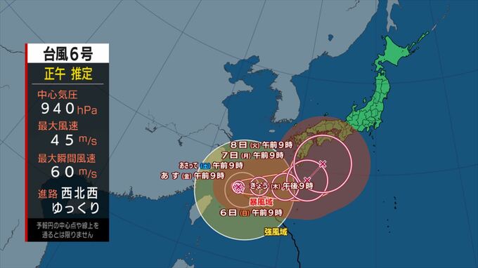 台風6号の今後の進路について、気象庁によりますと、4日午前9時には宮古島の北北西約250kmでほとんど停滞。5日にかけて進路を東北東へと変え、6日にかけては東へゆっくり進み、7日午前9時には九州の南に達する予想となっています。そして8日にかけては進路は北東となり、午前9時には四国沖に達する予想となっています。