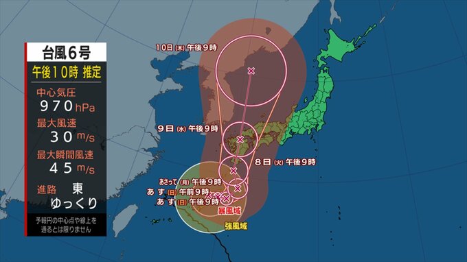 台風6号の今後の進路について、気象庁によりますと、6日午前9時には徳之島の東約60kmへ進み、6日午後9時には奄美大島の南東約110kmへ。