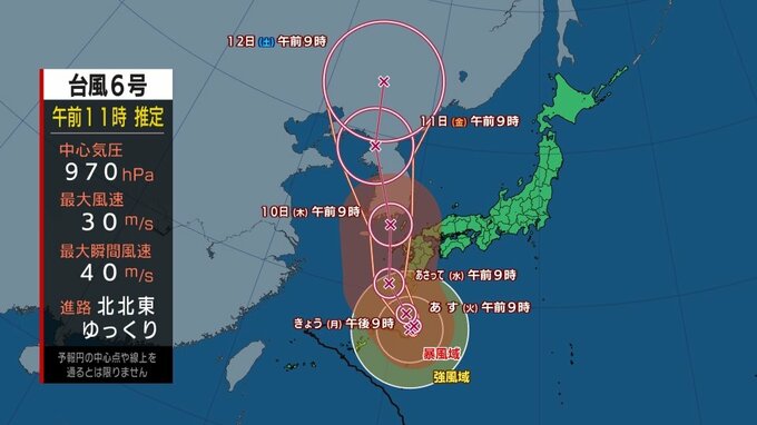 台風6号の今後の進路について、気象庁によりますと、7日午後9時には奄美市の東約180kmへ進み、8日午前9時には進路を北西に変え、屋久島の南約150kmへ進む予想です。