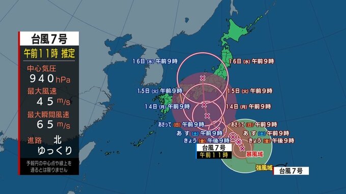 16日午前9時には980ヘクトパスカルとなって北へ進み、本州に達する予想となっています。