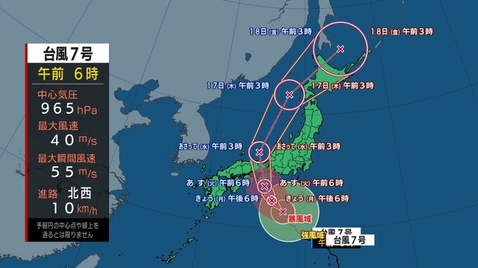 台風7号は、日本の南を北上して、15日は東日本や西日本にかなり接近し、上陸するおそれがあります。その後、16日は日本海を北へ進む見込みです。