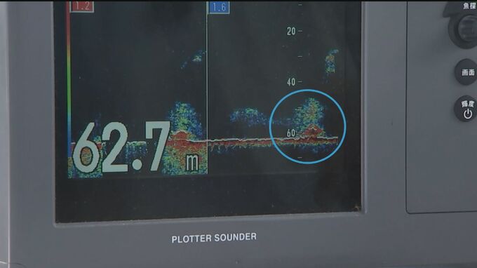 モニターに映し出された赤い部分が海底、そして、青い部分が魚の群れです。その間に何やら障害物が確認できます。