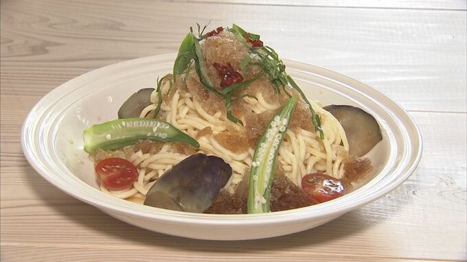 そしてこちらは「夏野菜の和風かき氷パスタ」。コーラ味のように見えるかき氷、こちらは醤油ソースでできています。