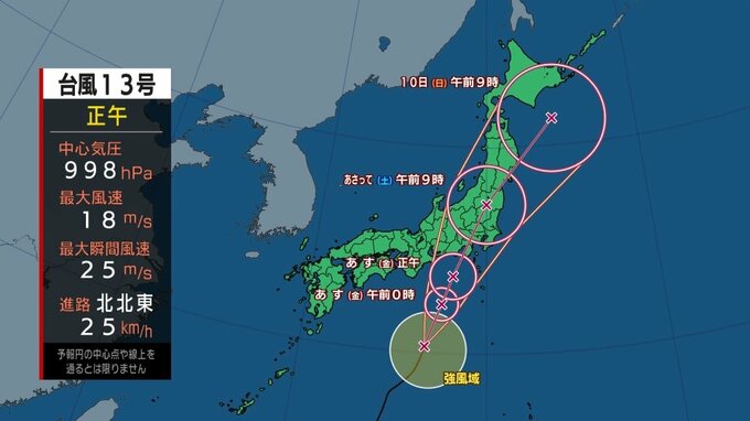 9日午前9時には東北地方にあって、北北東へ20キロの速さで進みます。中心の気圧は1002ヘクトパスカル、中心付近の最大風速は18メートル、最大瞬間風速は25メートル。