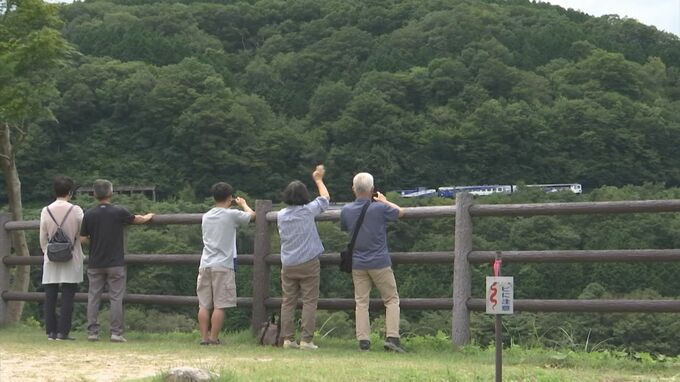 道の駅の展望台は、夏休み前に斜面の木などが切られて見晴らしが良くなりました。アナウンスに誘われるように観光客たちが集まり、列車に向けて手を振っていました。