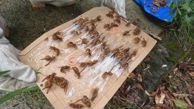 まずはハチを弱らせるために巣穴に殺虫剤を注入します。すると、巣穴からおびただしい数のスズメバチが出てきました。