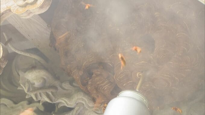 今回の依頼は、神社にできたキイロスズメバチの巣です。