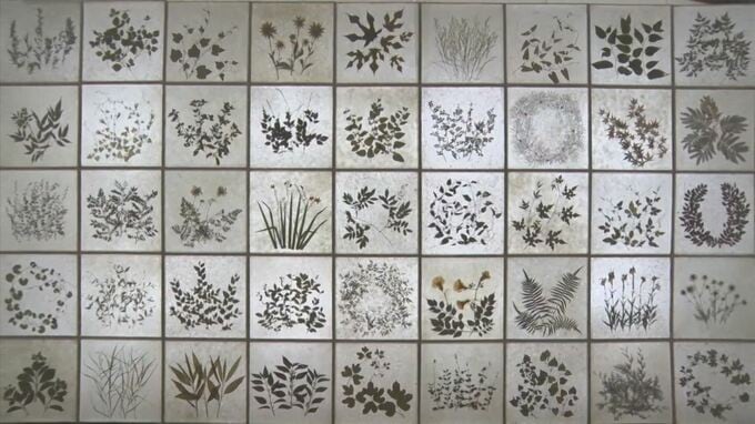 縦2.5メートル、横4.5メートルある大作「草木たちの集い」は、工房近くに生えている草木45種類を押し花にしたものを和紙に挟み、障子のように並べたもので、バックライトで照らすことでそれらの造形の素晴らしさが引き立ちます。