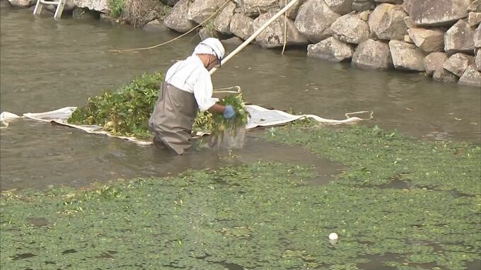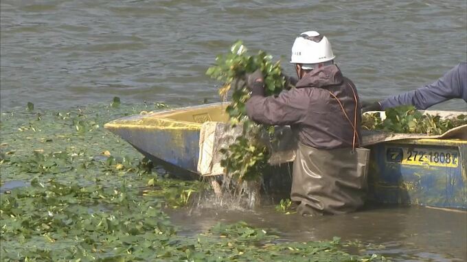 市によるとヒシがここまで大量に繁殖するのは初めてとのことで、除去作業は13日まで行われる予定です。