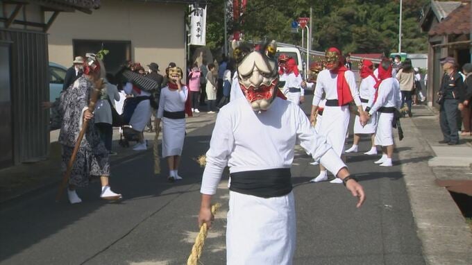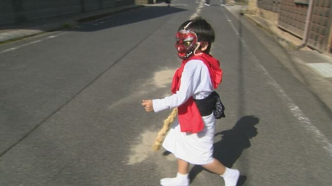 1年に1度、氏神様が里帰りする際に通る道を清める役目を果たすのが、鬼などの面をつけた「ガッチ」。「ガッチ」は、「シボ」と呼ばれるワラの棒で町中を清めて回ります。
