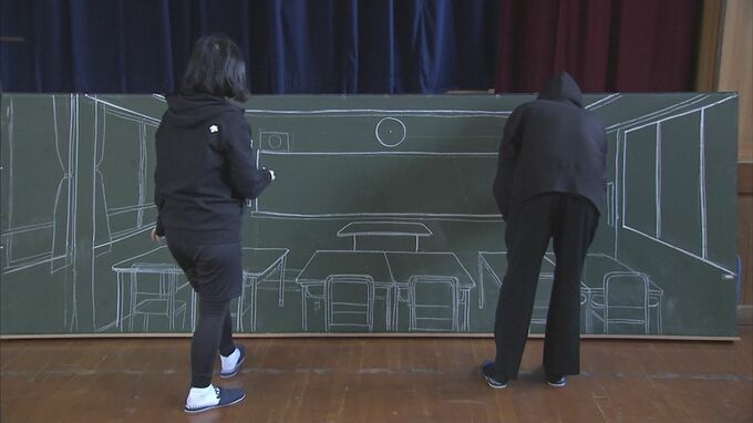 こうして決めた黒板アートのテーマの1枚は学校の教室。そして、もう1枚は大きな樹木です。