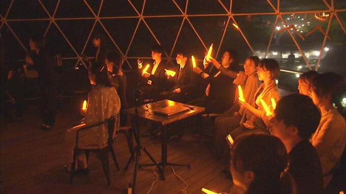 サプライズで、ゲストに妊娠を発表した2人。新たな命の性別を、サイリウムライトを折って出た色で出席者に伝える。