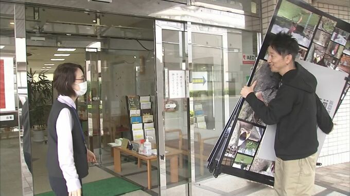 施設の職員と一緒に、早速、パネルの展示を始めます。