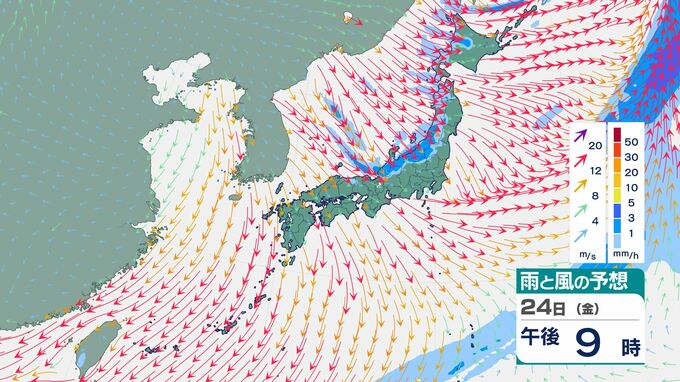 このため、24⽇から25⽇頃にかけて、⽇本付近は荒れた天気となり、北⽇本や東⽇本⽇本海側で⼤荒れや⼤しけとなるおそれがあります。
