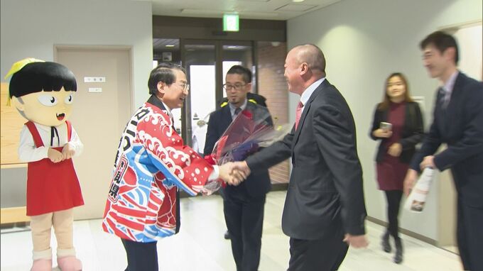18日昼過ぎに、香港からの初便が到着し、鳥取県の平井知事らが乗客を出迎えました。