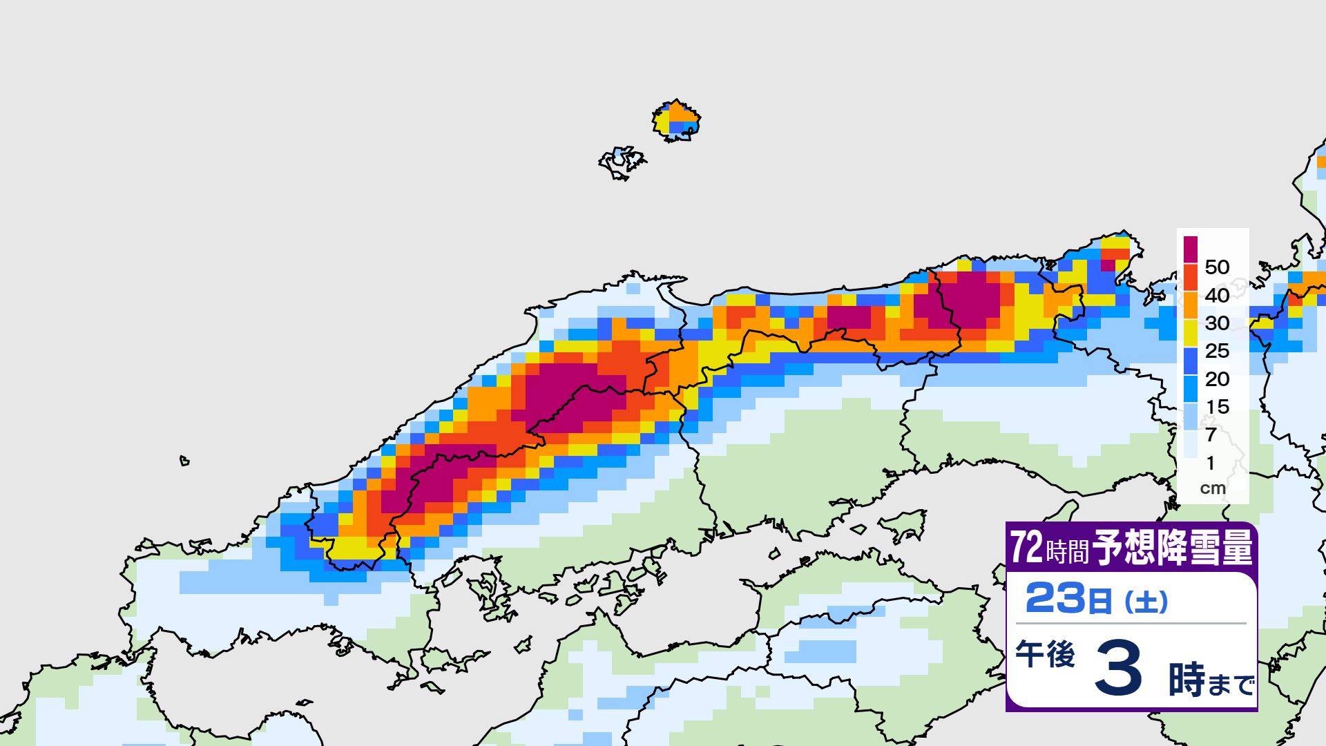 島根県から鳥取県の西部でも雪が降り続く見込みで、特に山沿いでは雪の量が増えるおそれがあります。