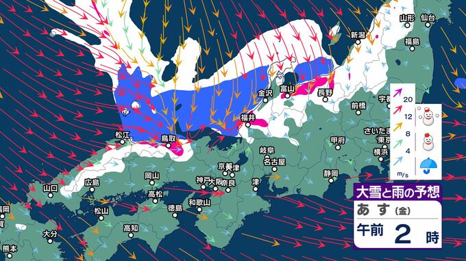 特に北寄りの風と北西寄りの風が集まる鳥取東部を中心に雪の量が増える見込みです。雪雲が発達して大雪になるおそれがあるので、降り方に注意が必要です。