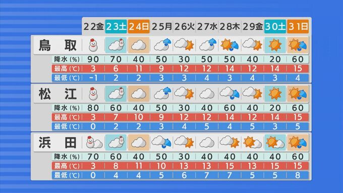 「23日の土曜日までは冬型の気圧配置が続いて雪が降るだろう。その後、寒気の下りも弱くなるために、気温も多少上がって、お天気も周期変化に変わっていくだろうと予想されています。年末に向かっても、大荒れというような天気がなさそうなので、雪に対する警戒は必要ないかと読み取れます」