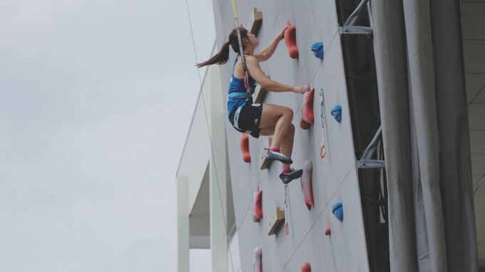 スピード種目では、壁に並ぶホールドを下から順に全部使うのではなく、一部を飛ばして登るとスピードアップできます。