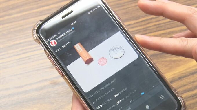 「こちらですね、22万いいね。自社紹介をしている87文字をハンコに掘ったものが22万いいねをいただきまして」