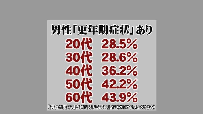 厚生労働省が2022年に行った、男性の更年期症状に関する調査結果によりますと、更年期の不調を感じている人は、20代で28.5%、30代で28.6%、40代で36.2%、50代で42.2%、60代で43.9%と、多くの男性が、何かしらの不調を感じていることが分かります。