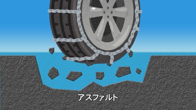 路面はもろくなり、そこにチェーンをつけた車などが通ると、衝撃が加わって、アスファルトが削れてしまうということです。