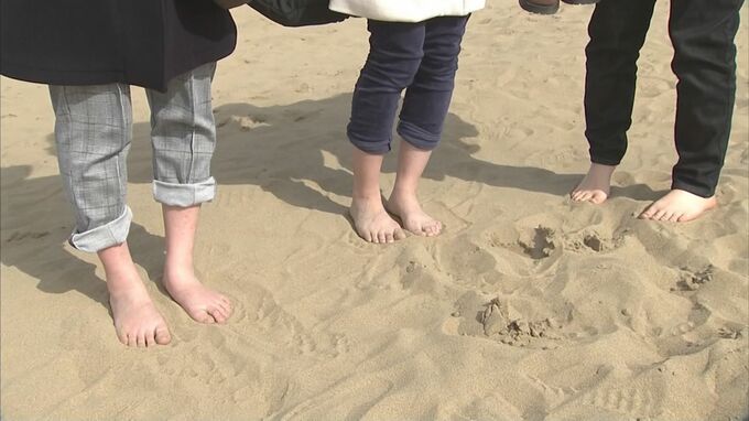 季節外れの暖かさに、県外から来た大学生は、靴を脱いで砂丘を歩く準備です。