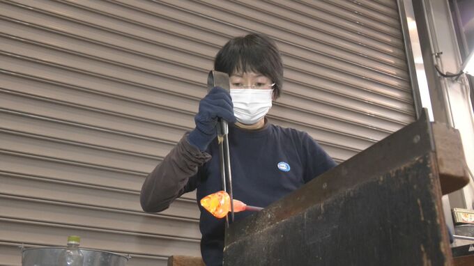 工房にある約1300℃の炉でガラス瓶を溶かして原型を作り、その後に粉状のガラスで色をつけ、1つずつ丁寧に手際よく仕上げていきます。