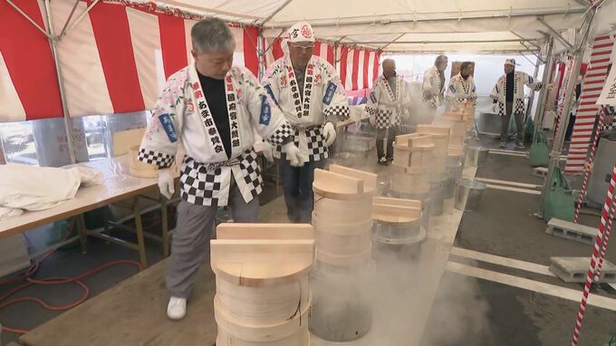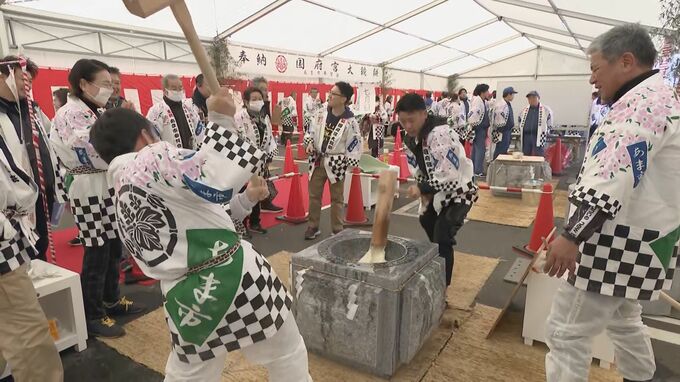 つきあげた餅の重さはなんと4トン。いよいよ2月22日に迫った愛知県稲沢市の国府宮はだか祭を前に、祭りで奉納される「大鏡餅」の餅つきが行われました。