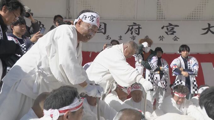 会場には祭りの主役「神男(しんおとこ)」の大桒佑起(おおくわ・ゆうき)さん(37)も駆け付け、地元の人たちの威勢の良いかけ声に合わせて餅をつきました。