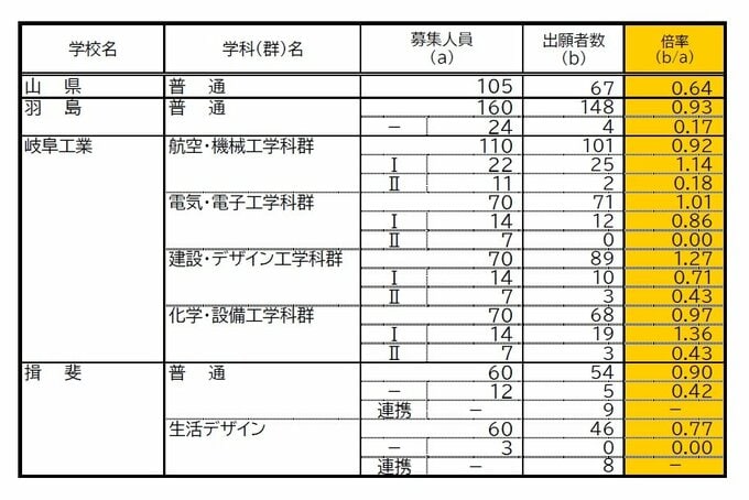 岐阜県公立高校入試2024 最終志願倍率 第一次・連携型選抜の出願状況 岐阜1.14倍 大垣北1.08倍 斐太1.03倍 【確定版】