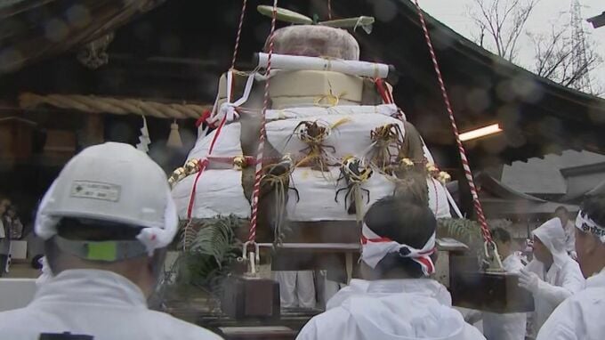 11時間をかけてつき上げた4トンの大鏡餅をクレーンで奉納 奉納の前にはトラックでパレードも 国府宮はだか祭 愛知・稲沢市 2024年2月21日(水) 18:31 国内 2月22日に迫った「国府宮はだか祭」の「もみ合い」を前に、愛知県稲沢市では重さ約4トンの大鏡餅の奉納が行われました。雨が降る中をトラックで運ばれてきたのは、22日に行われる「国府宮はだか祭」のために奉納さ…