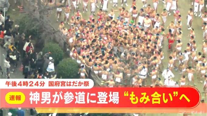 「神男」が登場 このあと「はだか男」による激しい“もみ合い”へ 天下の奇祭 国府宮はだか祭 愛知・稲沢市 2024年2月22日(木) 16:27 国内 愛知県稲沢市の国府宮で行われている「はだか祭」は、午後4時24分に祭の主役の「神男」が参道に登場しました。この後「神男」は楼門をくぐって儺追殿(なおいでん)を目指し、神男に触れようとする、はだか男たち…