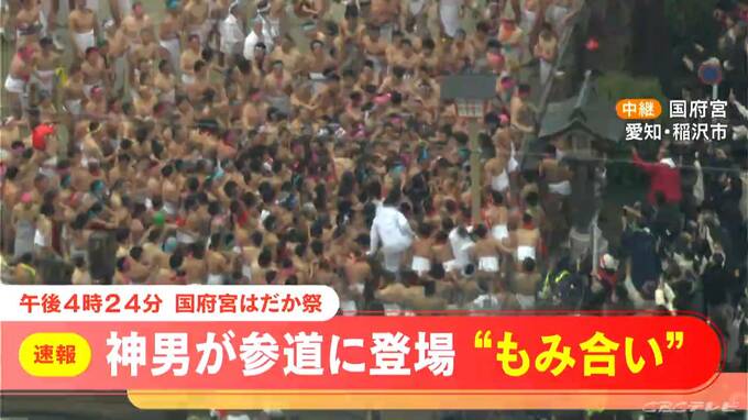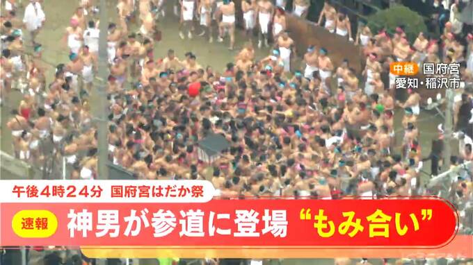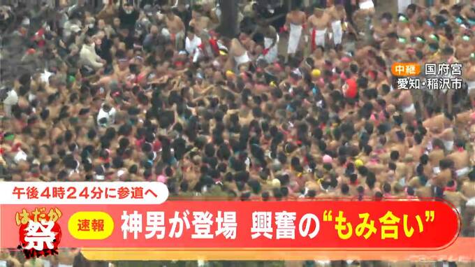 愛知県稲沢市の国府宮で行われている「はだか祭」は、午後4時24分に祭の主役の「神男」が参道に登場しました。